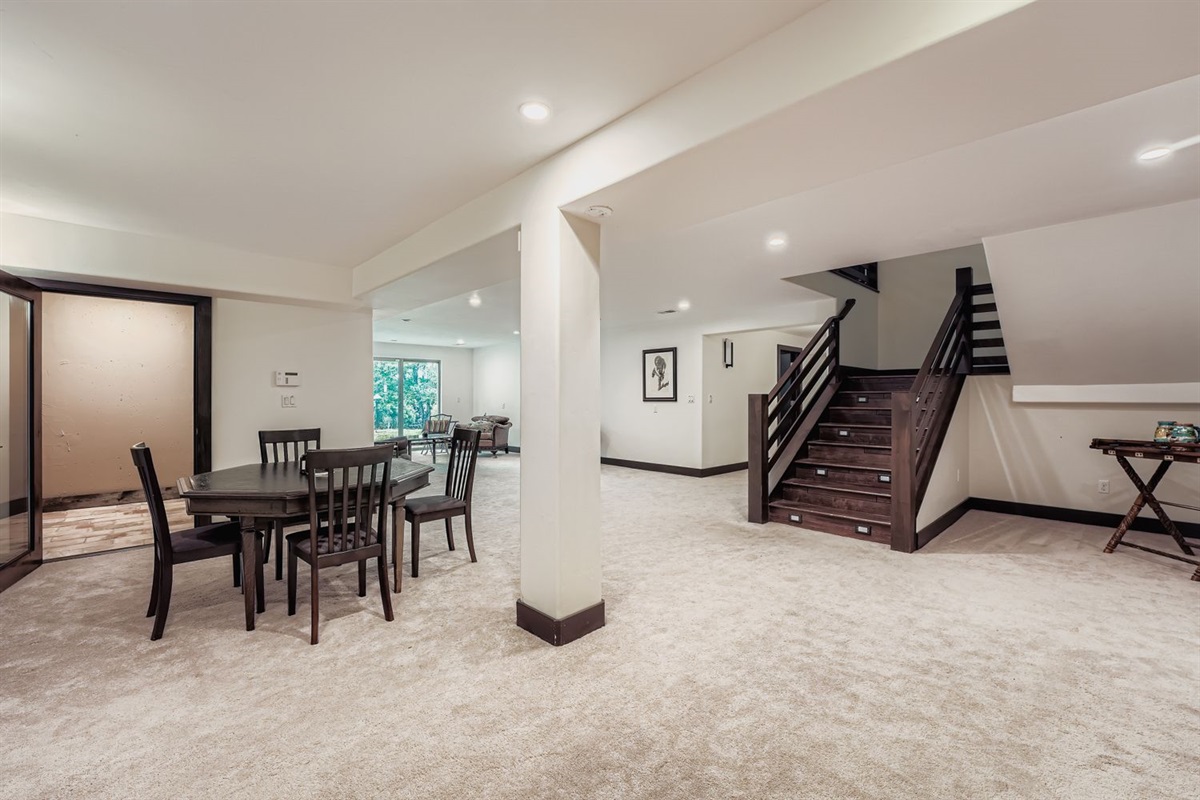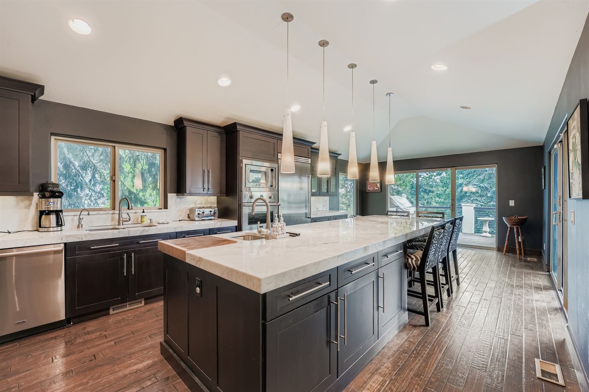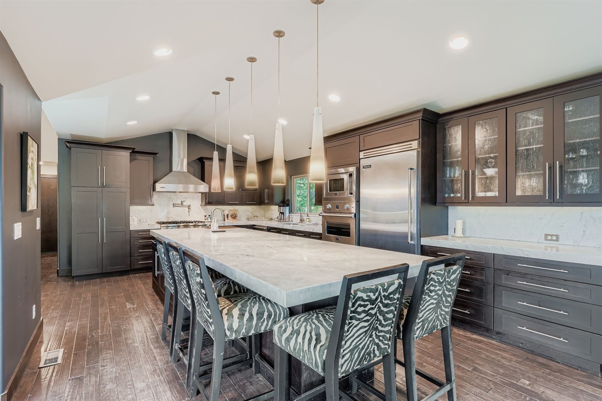 The chef's kitchen with viking appliances and oversized island flows seamlessly into a formal Living and Dining room that boasts the open living concept, ideal for hosting guests or enjoying a quiet evening in. Downstairs, an additional living room offers a relaxed setting for gatherings, movie nights, or separate entertaining space.